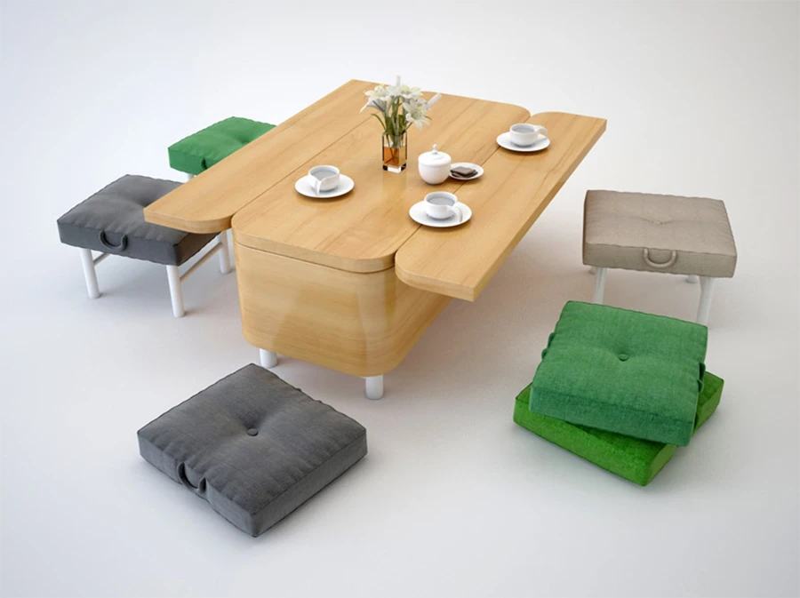 มองเผินๆ ดูเหมือนโซฟา แต่พอถอดไปถอดมาก็กลายเป็นโต๊ะเอามาใช้กินข้าวได้ แถมยังมีเก้าอี้เบาะให้สามารถใช้นั่งทานข้าวกันหลายๆ คนในหลายๆ มุมได้ด้วย (ออกแบบโดย Julia Kononenko)
