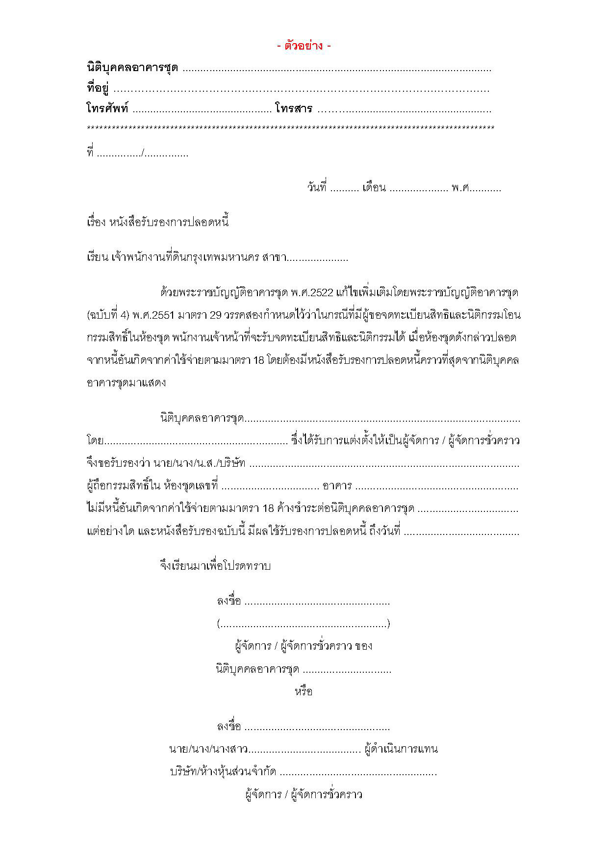 ก่อนวันโอน คนขายจะต้องเคลียร์หนี้ค่าส่วนกลางให้หมด เพราะในการโอนคอนโดนั้น เจ้าพนักงานกำหนดให้ต้องมีการนำ "หนังสือรับรองการปลอดหนี้" มาแสดงด้วยเวลาจดทะเบียนโอน (ซึ่งต้องเซ็นโดยผู้จัดการนิติบุคคลด้วยตามแบบของกรมที่ดินข้างล่างนี้) ไม่งั้นเจ้าพนักงานจะไม่รับจดทะเบียนโอนคอนโดให้ อนึ่ง หนังสือรับรองการปลอดหนี้จะพูดถึงแค่ค่าส่วนกลางตามมาตรา 18 ของ พรบ. อาคารชุดเท่านั้น ไม่ได้รวมถึงค่าน้ำ และค่าไฟด้วย ดังนั้น คนซื้อและคนขายควรกำหนดให้ชัดเจนว่าค่าน้ำ และค่าไฟฟ้าต่างๆ นับจนถึงวันที่คนขายยังเป็นเจ้าของคอนโดนี้ คนขายจะต้องชำระเองให้หมดสิ้น และนำใบเสร็จมาแสดงให้คนซื้อดูด้ํวย แต่ถ้านิติบุคคลเป็นคนเก็บค่าน้ำ ทางนิติบุคคลมักกำหนดให้เคลียร์ค่าน้ำให้หมดด้วยเลย ไม่งั้นจะไม่เซ็นหนังสือรับรองการปลอดหนี้ให้