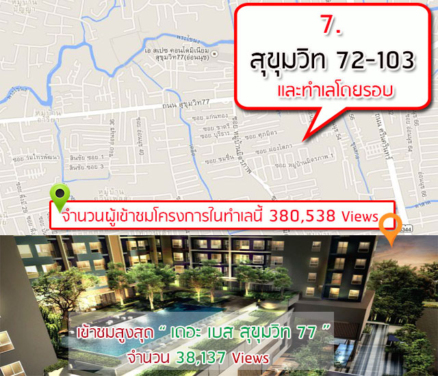 สุขุมวิทช่วงต้นไม่ติด 10 อันดับในที่นี่ แต่สุขุมวิทช่วง 25-71 ซึ่งกินพื้นที่ทองหล่อ และเอกมัยด้วยติดโผมาในลำดับที่ 5 บริเวณนี้รายล้อมไปด้วยห้างสรรพสินค้า โรงแรม ร้านอาหาร ตอบโจทย์ไลฟ์สไตล์ของคนรุ่นใหม่ และให้ผลตอบแทนในด้านการลงทุนสูง จึงให้ทำเลนี้เป็นที่ต้องการของทั้งชาวไทย และชาวต่างชาติเป็นจำนวนมาก โดยคอนโด 3 อันดับแรกที่มียอดผู้เข้าชมเยอะที่สุดในเว็บไซต์ของเราคือ