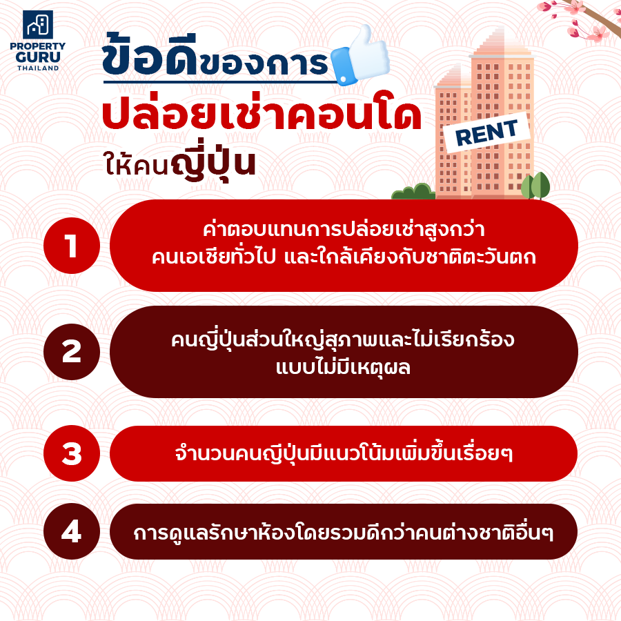 ปัจจุบันมีคอนโดใหม่ๆ เปิดตัวกันแถวสุขุมวิทมากมาย ทั้ง High-Rise (ริมถนนใหญ่) และ Low-Rise (ในซอย) ซึ่งพื้นที่นี้ถือได้ว่าเป็นทำเลยอดฮิตที่สุดพื้นที่หนึ่งของชาวต่างชาติ หลายคนที่เข้าไปจับจองคอนโดใหม่ๆ บริเวณนี้ส่วนใหญ่ตั้งใจว่าจะปล่อยเช่าให้คนต่างชาติ ซึ่งหนึ่งในคนต่างชาติที่เพิ่มจำนวนขึ้นเรื่อยๆ ในเมืองไทย และมีกำลังซื้อสูงคือ "ชาวญี่ปุ่น" วันนี้จึงมีเกร็ดความรู้เล็กๆ น้อยๆ ก่อนจะปล่อยเช่าคอนโดเพื่อให้ถูกใจคนญี่ปุ่นมาฝาก มีอะไรบ้างไปดูกันเลยยย