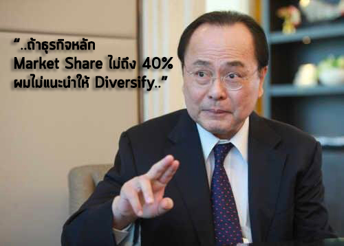 เวลาทำธุรกิจ ถ้าธุรกิจหลักเรา Market Share ยังน้อย อย่าเพิ่ง Diversify เพราะเราจะขาดการ Focus ในธุรกิจหลัก ถ้าจะให้ดี ธุรกิจหลักควรมี Market Share สัก 40% ถึงจะเริ่ม Diversify ได้