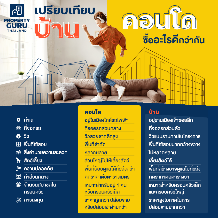 นี่เป็นความแตกต่างเพียงบางส่วนระหว่างการอยู่บ้านและคอนโดเท่านั้น สำหรับใครที่กำลังลังเลและตัดสินใจไม่ได้ว่าจะซื้อบ้านหรือซื้อคอนโดดีลองพิจารณาจากปัจจัยข้างต้น และลองถามใจตัวเองดูว่าแบบไหนตรงกับไลฟ์สไตล์และตอบโจทย์การใช้ชีวิตของคุณได้ดีกว่ากัน และที่สำคัญที่สุดอีกอย่างคือต้องสอดคล้องกับงบประมาณที่มีในกระเป๋าด้วยนะคะ