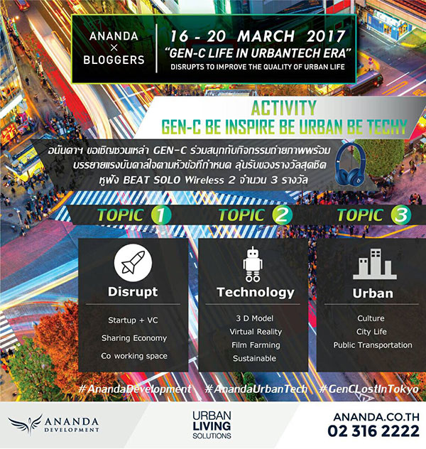 เพื่อเป็นการตอกย้ำความเป็น "Tech Company" รายแรกในวงการฯ อนันดาฯ พา Blogger จากสื่อออนไลน์ชั้นน้ำในเมืองไทย เช่น Checkraka, Marketeer, Unlockmen, DDproperty ไปไกลถึงประเทศญี่ปุ่นกันอีกครั้ง โดยมีธีมการเดินทางไปชื่อว่า "GEN-C Life in UrbanTech Era" พบกับทีม Startup และ Venture Capital (VC) ของประเทศญี่ปุ่น ดูเทคโนโลยีที่เกี่ยวกับการใช้ชีวิตและการอยู่อาศัยของคนรุ่นใหม่ ซึ่งเราได้บุกไปเยี่ยมชมสถานที่ทำงานจริงและฟังการบรรยายพร้อมพูดคุยในเรื่องต่างๆ กับทีมงาน Startup ของที่นั่นอย่างใกล้ชิดกันอีกด้วย ซึ่งบรรดาเทคโนโลยีที่กำลังจะไปชมนี้ก็อาจจะมีการนำมาปรับใช้หรือผสมผสานเข้ามาใน platform ของอนันดาที่เป็นผู้นำในด้าน Urban Tech ของวงการอสังหาริมทรัพย์ในประเทศไทยด้วยค่ะ