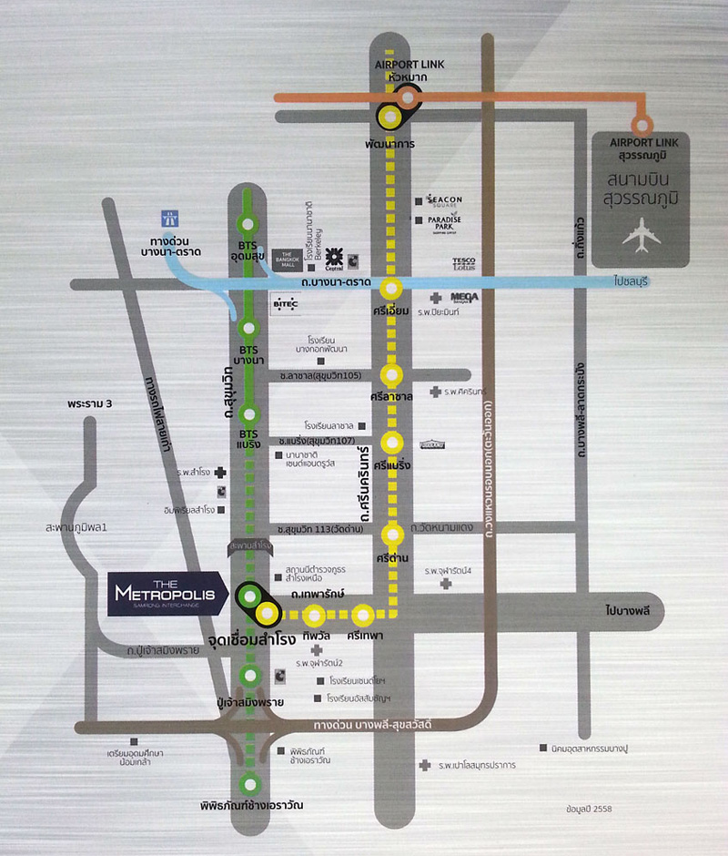 อย่างที่ได้เกริ่นไปเมื่อตอนต้นนะคะว่าโครงการนี้มีจุดเด่นอยู่ตรงที่ใกล้รถไฟฟ้ามากๆ เพราะฉะนั้นการเดินทางด้วยรถไฟฟ้าถือเป็นวิธีที่สะดวกทีเดียวค่ะ สำหรับสถานีที่ใกล้ที่สุดของโครงการคือสถานีสำโรง เรียกได้ว่าติดโครงการเลยทีเดียว อีกทั้งสถานีสำโรงนั้น เป็นจุดเชื่อมต่อไปยังรถไฟฟ้า MRT สายสีเหลืองด้วยเช่นกัน สามารถเดินทางต่อไปยังศรีนครินทร์ได้อย่างสะดวกรวดเร็ว คาดว่าจะเปิดประมูลเพื่อหาผู้รับเหมาก่อสร้างได้ในปี 2559