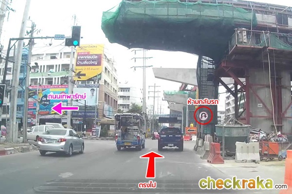 ด้านหน้าเป็นทางแยกเทพารักษ์ มีป้ายห้ามกลับรถ ตรงนี้ยังกลับไม่ได้ค่ะ