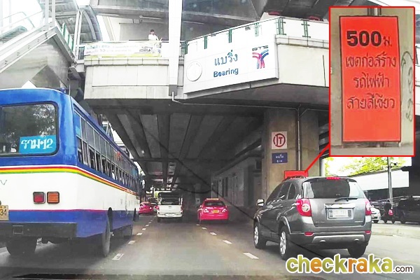 สถานีต่อไปเป็นแบริ่ง มีแปะป้ายเข้าเขตก่อสร้างส่วนต่อขยายสายสีเขียวแล้วค่ะ