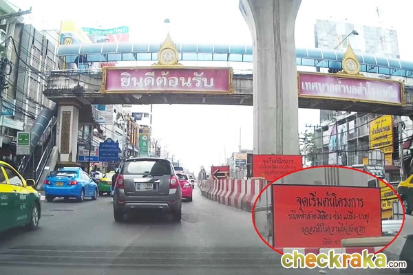 เริ่มเข้าเขตตำบลสำโรงเหนือแล้ว มีแปะป้ายเตือนระมัดระวังการก่อสร้างโครงการรถไฟฟ้าเป็นระยะๆ