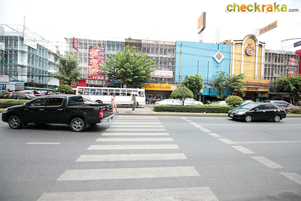 หน้าธนาคารกรุงเทพมีทางม้าลายค่ะ มองไปฝั่งตรงข้ามมีร้านทองและ Pizza Hut ด้วย