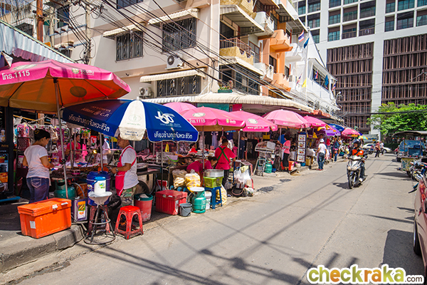 ส่วนฝั่งตรงข้ามจะเป็นร้านแผงลอยเรียงรายตลอดเส้นทาง