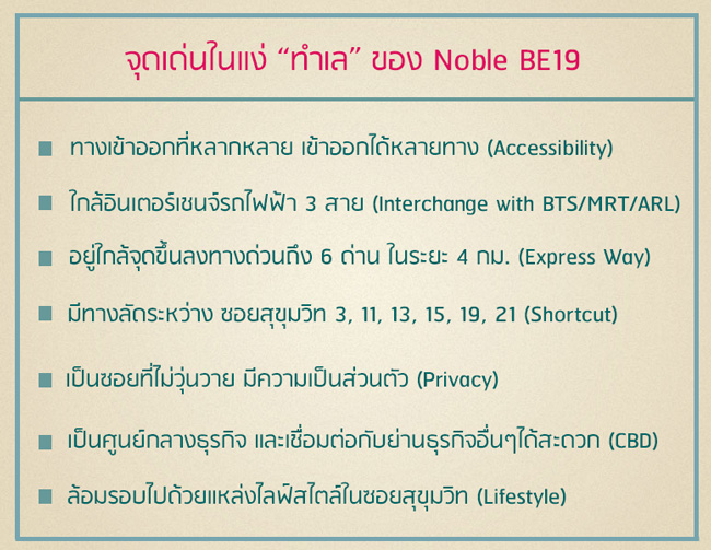 โครงการ Noble BE19 มีจุดเด่นหลายอย่าง ทั้ง Location และ Transportation ที่โดดเด่น มีทางลัดเข้าออกได้รอบทิศทางในย่านอโศก-สุขุมวิท อยู่ใกล้ Interchange รถไฟฟ้า BTS, MRT และ Airport Rail link เชื่อมต่อกับแหล่งธุรกิจ CBD ต่างๆ บวกกับ Lifestyle ที่รายล้อมทุกรูปแบบ ไม่ว่าจะเป็นแหล่ง Shopping ใกล้ๆโครงการอย่าง Terminal 21 และ The Em District รวมถึง ร้านอาหารนานาชาติ และ 5-Star Street Food ที่อยู่รอบๆ ย่านอโศก