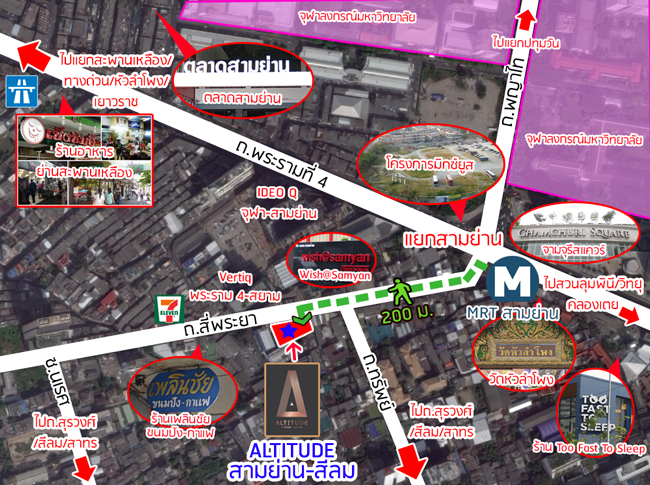 วันนี้เราจะพาไปชมทำเลโครงการ "อัลติจูด สามย่าน-สีลม (Altitude Samyan-Silom)" คอนโดน้องใหม่ของค่ายอัลเทอร์เนทีฟแอสเซท ที่มาพร้อมกับแนวคิด "ที่สุดสมดุลแห่งดีไซน์ของคอนโดมิเนียมใจกลางเมือง" โครงการนี้เป็นคอนโดมิเนียมแบบ Low rise สูง 8 ชั้น หนึ่งชั้นใต้ดิน 97 ยูนิต บนเนื้อที่ 285 ตารางวาพร้อมที่จอดรถ 43 คัน และพื้นที่จอดรถจักรยาน และที่สำคัญห่างจากสถานีรถไฟฟ้าใต้ดินสามย่าน เพียง 200 เมตร น่าสนใจขนาดนี้ Checkraka.com จึงขอลงพื้นที่พาไปสำรวจทำเลรอบๆ โครงการให้ผู้อ่านได้ชมกันค่ะ