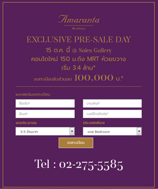สอบถามรายละเอียดเพิ่มเติมได้ที่ โทร. 02-275-5585 หรือ www.amaranta-residence.com