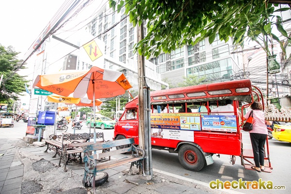 เดินเข้าไปตามถนนประชาราษฎร์บำเพ็ญ ต้นซอยจะมีจุดขึ้นรถสองแถว คอยบริการ