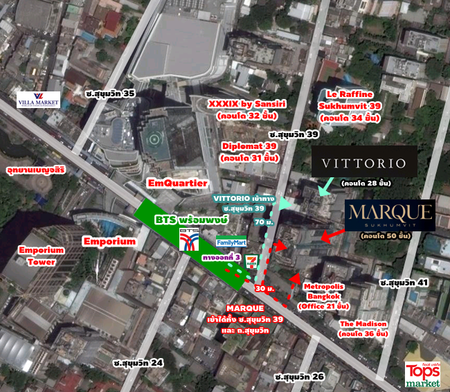 ภาพรวมในด้านทำเล ทั้ง 2 โครงการ ตั้งอยู่บน Prime Location ใจกลางเมือง ไม่ว่าจะเป็นการเดินทางด้วยรถไฟฟ้า BTS พร้อมพงษ์ที่อยู่ใกล้ๆ เดินเพียงไม่กี่ก้าวเท่านั้น (BTS ห่างจาก MARQUE Sukhumvit เพียง 30 ม. และ Vittorio เพียง 70 ม. เท่านั้น) หรือหากใช้รถยนต์ ก็มีทางด่วน ด่านฯ สุขุมวิท และด่านฯ อโศก ที่อยู่ไม่ไกล นอกจากนี้ ภายในซอยสุขุมวิท 39 ก็สามารถลัดเลาะไปยังซอยใกล้เคียงต่างๆ ทะลุไปถึงถนนอโศก, เพชรบุรี และทองหล่อ ได้สะดวก ส่วนแหล่ง Shopping ใกล้ๆ ก็มี The Em District ที่อยู่ใกล้มากๆ ในระยะเดินได้ (ห่างจากโครงการเพียง 100 ม.) โดยรวมแล้วถือว่าเป็น 2 โครงการที่อยู่ในทำเลที่ Prime สุดๆ จริงๆ ค่ะ หากโครงการมี Update เพิ่มเติม ทาง CheckRaka.com จะเก็บมาฝากนะคะ แล้วพบกันใหม่กับพรีวิวทำเลคอนโดใหม่ค่ะ