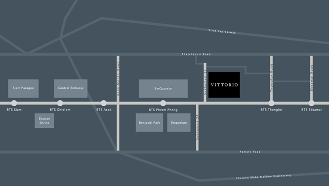Vittorio และ MARQUE Sukhumvit ตั้งอยู่ที่ ซอยสุขุมวิท 39 แขวงคลองตันเหนือ เขตวัฒนา กรุงเทพมหานคร ใกล้รถไฟฟ้า BTS สถานีพร้อมพงษ์ (MARQUE Sukhumvit 30 ม. และ Vittorio 70 ม.) เชื่อมต่อกับถนนสำคัญใจกลางเมือง เช่น ถนนอโศกมนตรี, ถนนพระรามที่ 4, ถนนเพชรบุรี, ถนนรัชดาภิเษก, ซอยสุขุมวิท 3 (นานา), ซอยสุขุมวิท 55 (ทองหล่อ) และซอยสุขุมวิท 63 (เอกมัย) ใกล้สถานที่สำคัญ และแหล่ง Shopping ชั้นนำ เช่น The EM District (Emporium, EmQuartier และEmsphere), Terminal 21, Miracle Mall, Tops Market, Villa Market, Rain Hill, K Village, อุทยานเบญจสิริ, โรงเรียนนานาชาติอเมริกันกรุงเทพ และโรงพยาบาลสมิติเวช