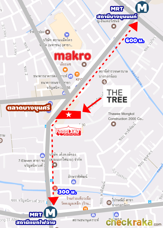 แผนที่ระยะทางเดินจากโครงการ The Tree Charan ไปรถไฟฟ้าสายสีน้ำเงิน
