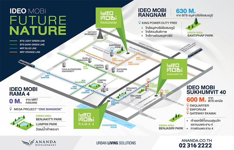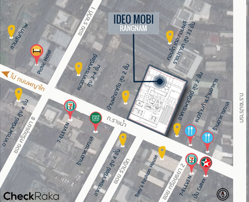 ส่วนเรื่อง "รถสาธารณะ" นี่ถือว่าอยู่ย่านอนุสาวรีย์ชัยฯ ไม่ต้องมีรถส่วนตัวก็ได้ เพราะมีแหล่งร่วมรถตู้อยู่ข้างเซ็นเตอร์วัน มีพี่วินคอยให้บริการหลายจุด มีราคาติดไว้ชัดเจน และสุดท้าย "รถไฟฟ้า" เป็นอะไรที่อนันดาเขาเน้นมาให้อยู่แล้ว Ideo Mobi รางน้ำ ก็ห่างจากสถานีอนุสาวรีย์ชัยฯ ประมาณ 630 เมตร ถือว่าอยู่ในระยะที่เดินได้ แล้วทางเท้าที่เดินนั้นก็พอดีๆ มีร้านค้าและร้านสะดวกซื้อกระจายตัวอยู่ ไม่มืดเท่าไหร่ สรุปว่า ทำเลนี้น่าอยู่ พอดีๆ ยังไม่แออัดมาก สถานที่อำนวยความสะดวกต่างๆ ที่จำเป็นก็มีครบจบในย่านเดียว อธิบายตอนนี้อาจจะยังไม่เห็นภาพ เลื่อนดูข้างล่างนี้ได้เลยค่ะ