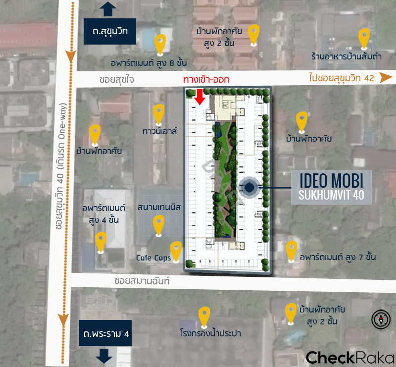 Ideo Mobi สุขุมวิท 40 อยู่ภายในซอยสุขุมวิท 40 ตัวโครงการตั้งอยู่ระหว่างซอยสมานฉันท์ และซอยสุขใจ ห่างจากรถไฟฟ้า BTS สถานีเอกมัยประมาณ 600 เมตร โดยประตูทางเข้า-ออกโครงการมีทางเดียวอยู่ฝั่งซอยสุขใจเท่านั้น ถ้าถามว่าระยะประมาณนี้พอจะเดินได้มั้ยก็ต้องบอกว่าถ้าช่วงกลางวันก็อาจจะร้อนนิดหน่อยพอมีเหงื่อให้ซึมๆ บ้าง แต่ถ้าเป็นตอนเย็นแดดร่มๆ หน่อยระยะนี้ก็ถือว่าเดินได้สบายๆ