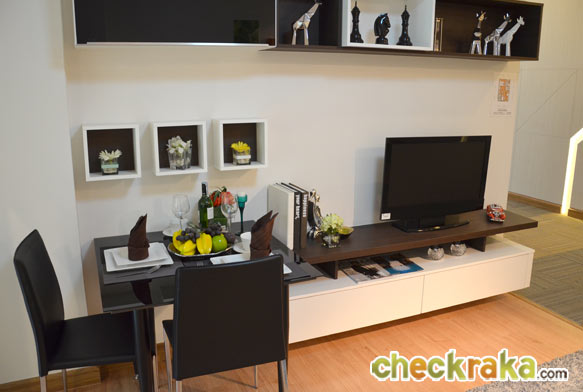ห้องนี้วาง LCD บนโต๊ะวางทีวี Built-in ด้านบนเป็นตู้ใส่ของลอยติดผนังดีไซน์และฟังก์ชั่นการใช้งานแตกต่างจากห้องสตูดิโอนิดหน่อย ถัดจากส่วนวางทีวีจัดโต๊ะทานข้าวพร้อมเก้าอี้มาให้นั่งทานกันแบบสองต่อสอง