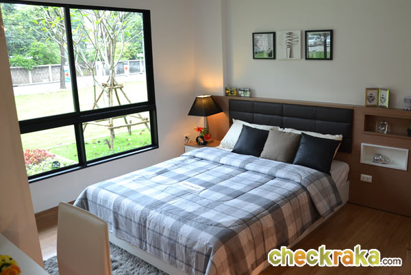ด้านในสุดจัดวางไว้เป็นพื้นที่ส่วนห้องนอนวางเตียงควีนไซส์ได้กำลังดี หัวเตียงกรุหนังนิ่มๆ พร้อมช่องใส่ของโต๊ะหัวนอนที่ใช้วางโคมไฟ กระจกบานใหญ่ขนาด 2 บานเป็นกรอบอะลูมิเนียมรมดำ