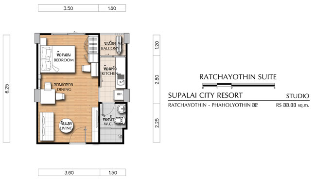 - Ratchayothin Suite สตูดิโอขนาด 33 ตร.ม. (คลิกเพื่อดูแปลนห้อง)