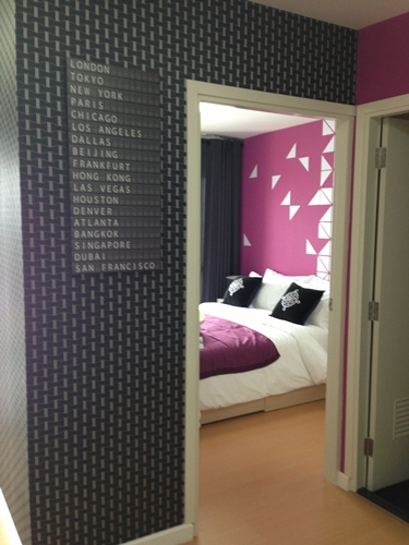 ห้องที่สองกับแบบ Issey Miyake ห้องที่ตกแต่งเน้นสีม่วงและดำ พร้อมของตกแต่งแนวเมทัลลิกเพื่อเพิ่มความหรูหรา