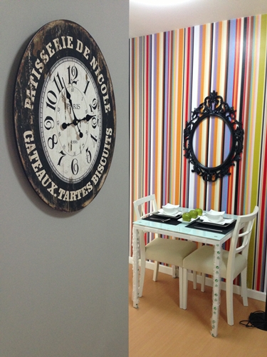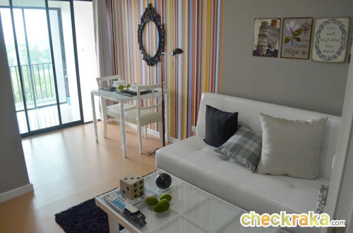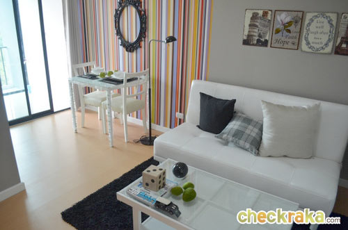 เรามาเริ่มกันที่แบบแรกกับห้อง Benetton โดยจะตกแต่งแนว Colorful เน้นสีสันสดใส ห้องนั่งเล่นและห้องนอนปูด้วยพื้นไม้ลามิเนตซึ่งผิวสัมผัสจะรู้สึกนุ่มเท้ากว่ากระเบื้อง ห้องนั่งเล่นตกแต่งด้วยเฟอร์นิเจอร์เน้นสีขาวสลับกับสีไม้ดูสบายตา และในส่วนห้องนอนห้องนอนตกแต่งด้วยโต๊ะเครื่องแป้งเล็กๆ น่ารักเพียงพอต่อการใช้งาน