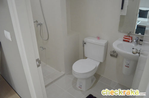 ห้องน้ำมีการแยกส่วนเปียกและส่วนแห้ง ปูด้วยกระเบื้องกันลื่น พร้อมติดตั้งพัดลมดูดอากาศมาให้เรียบร้อย