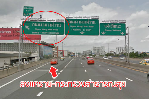 ลงทางด่วนงามวงศ์วานตามป้ายถนนงามวงศ์วาน (แคราย-กระทรวงสาธารณสุข)