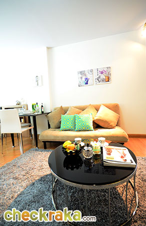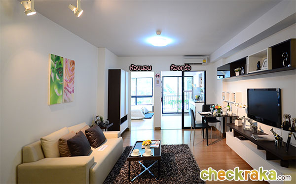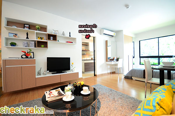 เข้ามาตรงพื้นที่กลางห้อง ที่แยกส่วนห้องนอนและห้องครัวไว้เป็นสัดส่วน