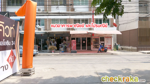 หากมองจากในโครงการออกไปด้านนอกจะเห็นแนวอาคารพาณิชย์ และร้านไปรษณีย์ไทย