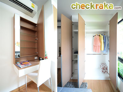 เปิดกระจกโต๊ะเครื่องแป้ง และตู้เสื้อผ้าให้เห็นพื้นที่เก็บของค่ะ