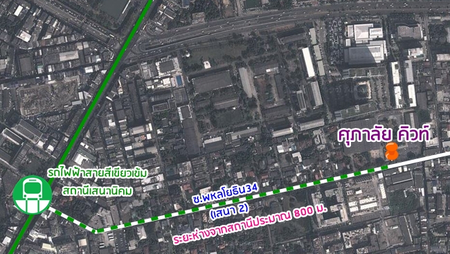 โครงการรถไฟสายสีเขียวเข้ม (หมอชิด-สะพานใหม่) คาดว่าจะสามารถเปิดบริการได้ช่วงปี 2561 โดยสถานีที่ใกล้กับศุภาลัย คิวท์ ก็คือ สถานีเสนานิคม ซึ่งอยู่บริเวณด้านหน้าซอยพหลโยธิน 34 พอดีเลย อยู่ห่างจากโครงการประมาณ 800 ม. เป็นระยะที่สามารถเดินได้อยู่ หรือถ้าจะนั่งมอเตอร์ไซค์รับจ้าง หรือว่ารถรถซูบารุเล็ก ที่ผ่านหน้าโครงการตลอดก็ค่อนข้างสะดวกค่ะ แต่ว่าจะต้องรอให้รถไฟฟ้าสร้างเสร็จอีกนิดนึงถึงจะได้ใช้นะคะ