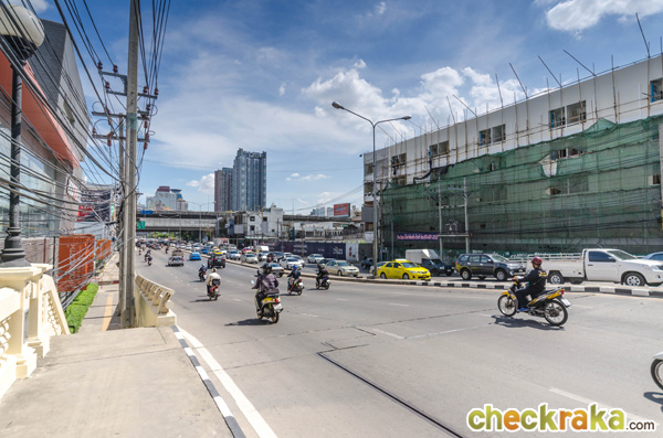 ตรงเข้าถนนเพชรอุทัยมานิดนึงแล้วข้ามทางรถไฟ (We drive along Petchuthai Road and go over the rail-track)