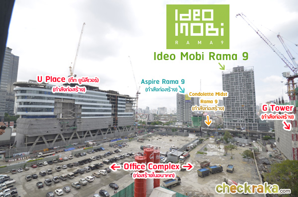 ภาพถ่ายจากฝั่งเซ็นทรัล พระราม 9 มองไปจะเห็น IDEO Mobi Rama 9 ตึกใหม่ที่กำลังก่อสร้าง และตึกใกล้เคียง