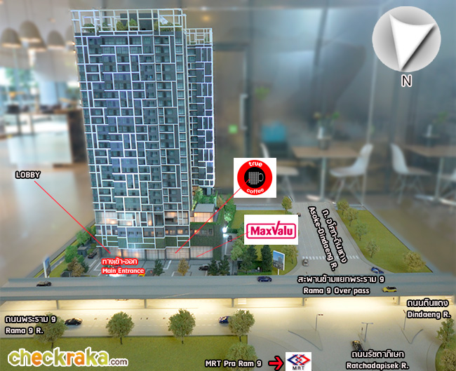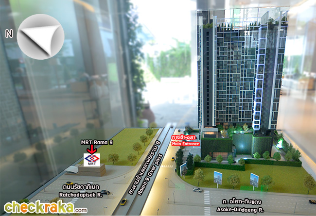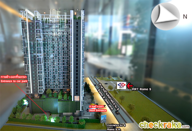 สำหรับการเดินทางด้วยรถไฟฟ้า สามารถเดินไปขึ้นรถไฟฟ้าได้ที่รถไฟฟ้า MRT สถานีพระราม 9 (ห่างจากโครงการประมาณ 80 เมตร) (ดูเส้นทางการเดินรถได้จากแผนที่รถไฟฟ้าด้านล่าง) (We can travel by subway by walking to and from Rama 9 MRT Station (about 80 meters away))