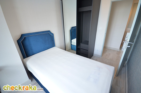 ห้องนอนเล็กอยู่ฝั่งตรงข้าม ประตูทางเข้าเยื้องไปทางซ้ายจากประตูห้องน้ำ ภายในมีเตียง 3.5 ฟุต และบิ้วท์อินโต๊ะทำงานติดกระจกฝั่งห้อง พร้อมตู้เสื้อผ้า 2 บานประตูมาให้ (The small bedroom is situated opposite the living bathroom. Inside this bedroom, there are 3.5-foot-sized bed and built-in working desk as well as two door wardrobe)