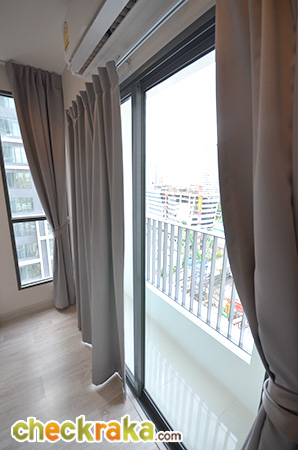 ผ้าม่านกันแสง สีเข้มแบบที่เห็น ทางโครงการก็แถมให้นะคะ ส่วนระเบียงก็จะมีขนาดเล็กประมาณอย่างที่เห็นในรูป
