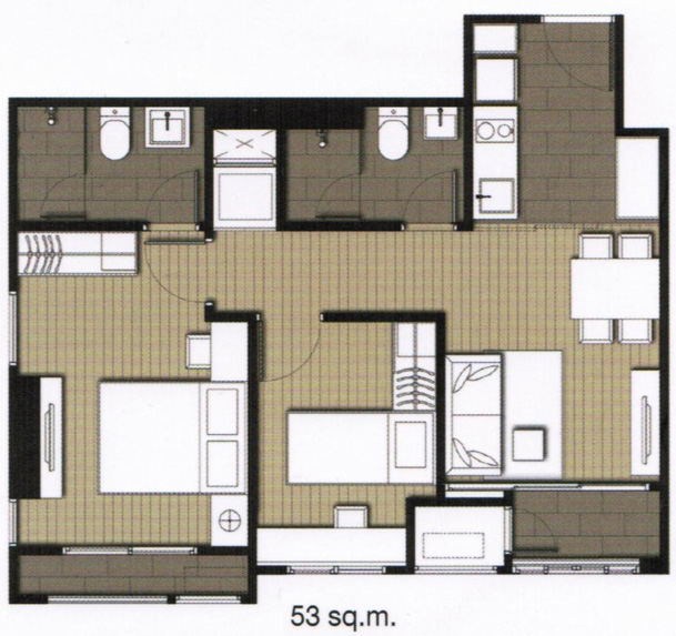 ภาพแปลนห้องแบบ 2 ห้องนอน 2 ห้องน้ำ ขนาด 53 ตร.ม.