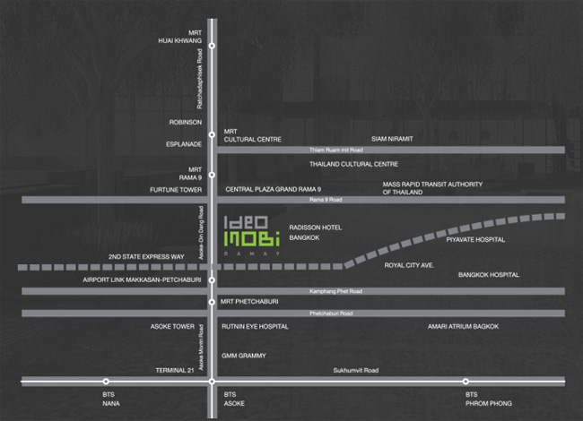 IDEO Mobi Rama 9 is located on Rama 9 Road, Huay-Kwang District, Huay-Kwang Sub-District, Bangkok. It is close to Rama 9 MRT Station, Sri-Rat Expressway, Central Rama 9, Grand Mercure Hotel, Fortune, Fortune Town, G-Land, Esplanade, True Tower, AIA Capital Center and Rama 9 Hospital.