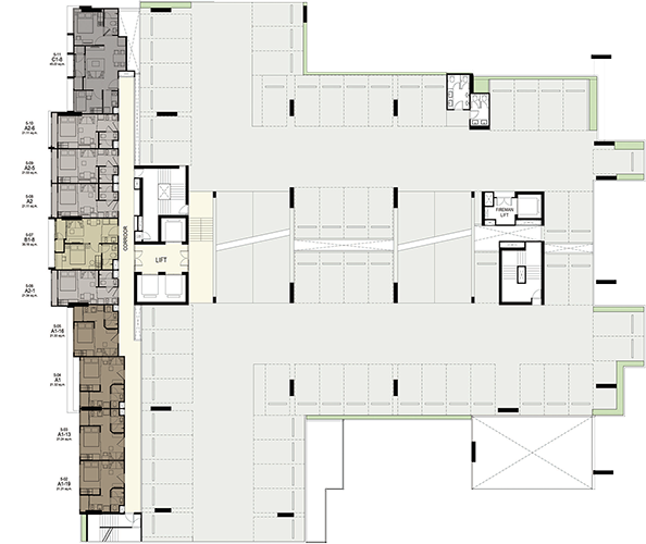 (5 main types of units: 21-sq m studio unit, 30-sq m one-bedroom unit, two-bedroom unit ranging in size from 43-56 sq m, 43-sq m one-bedroom duplex unit and 60-sq m two-bedroom duplex unit) - ที่จอดรถประมาณ 42% (297 คัน) ยังไม่รวมจอดซ้อนคัน