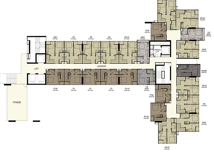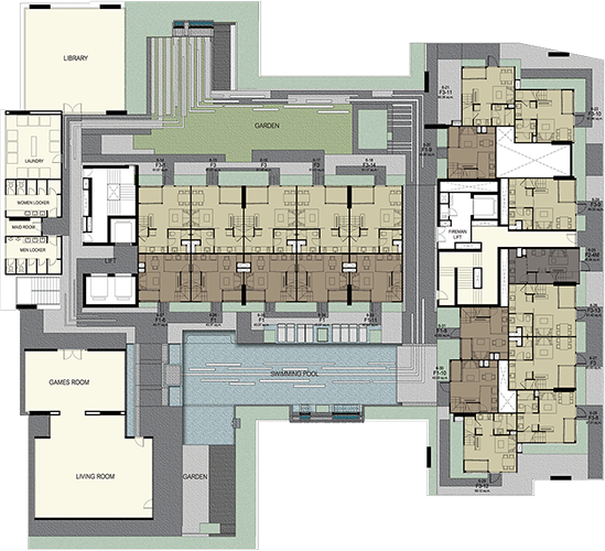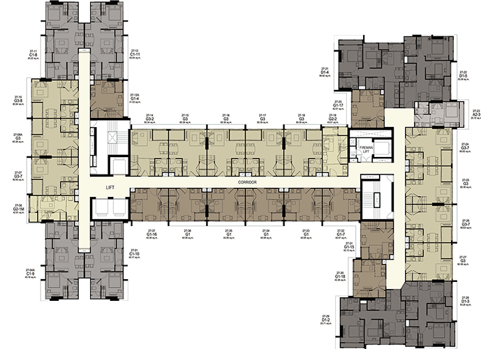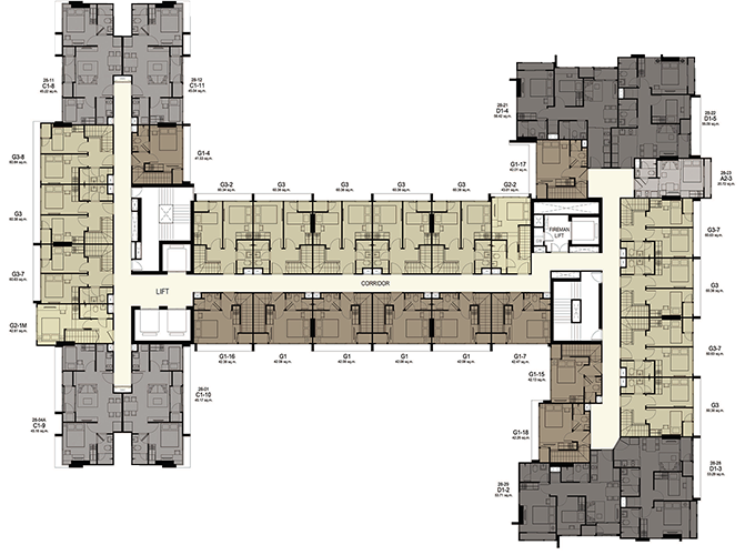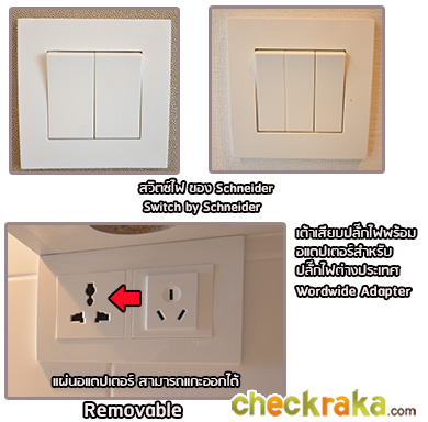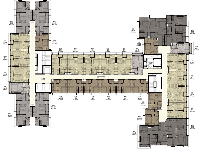 (3 passenger elevators and 1 freight elevator) - ห้องชุดมี 5 ขนาดหลักๆ คือ สตูดิโอขนาด 21 ตร.ม. 1 ห้องนอนขนาด 30 ตร.ม. 2 ห้องนอนขนาดตั้งแต่ 43-56 ตร.ม. Duplex 1 ห้องนอนขนาด 43 ตร.ม. และ Duplex 2 ห้องนอนขนาด 60 ตร.ม.