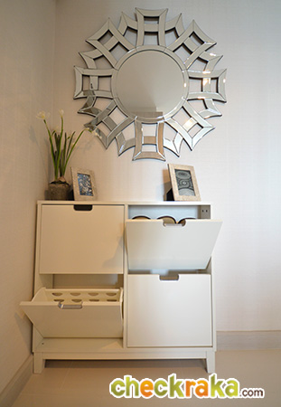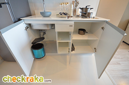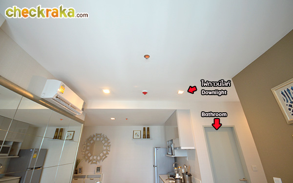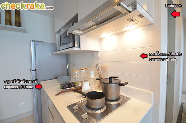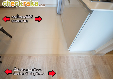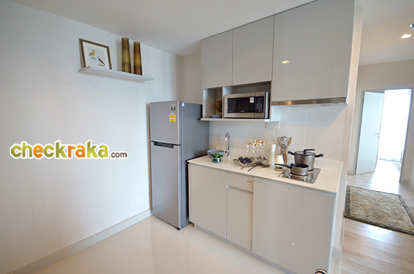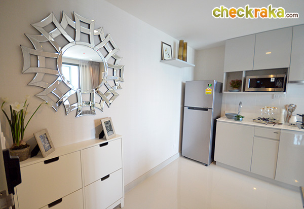 (งานวัสดุ เฟอร์นิเจอร์ได้ตามภาพ และเป็นงานเดียวกันกับห้องตัวอย่างก่อนหน้านะคะ ยกเว้นเครื่องใช้ไฟฟ้าที่แถมให้เฉพาะห้องขนาด 55.0 ตร.ม. ขึ้นไปค่ะ) (Once we walk inside, we can see the long-shaped walkway which houses the pantry, shoe cupboard and refrigerator. The materials and furniture shown on the above photo come with this sale unit and are similar to those of the previous fully furnished and decorated unit viewed earlier (with the exception of electrical appliances which are given only to those units of the size of at least 55 sq.m.))