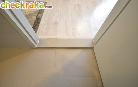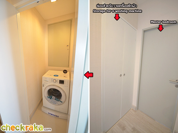 เตรียมพร้อมลุยกับความชื้นค่ะ ส่วนขวามือเป็นตำแหน่งประตูห้องนอน Master Bedroom ค่ะ (In front of the small bedroom, there is a tiny built-in storage room for washing machine with its floor being covered by granito tiles ready to absorb wet and damp. The right side is the entrance door for the master bedroom)