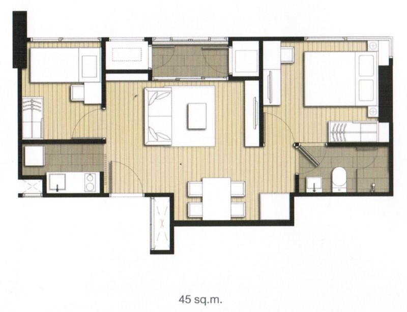 - ห้องแบบ 2 ห้องนอน ขนาดพื้นที่ 45.0 ตร.ม. แต่ง Standard ราคา 6,590,000 บาท