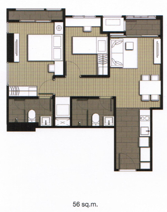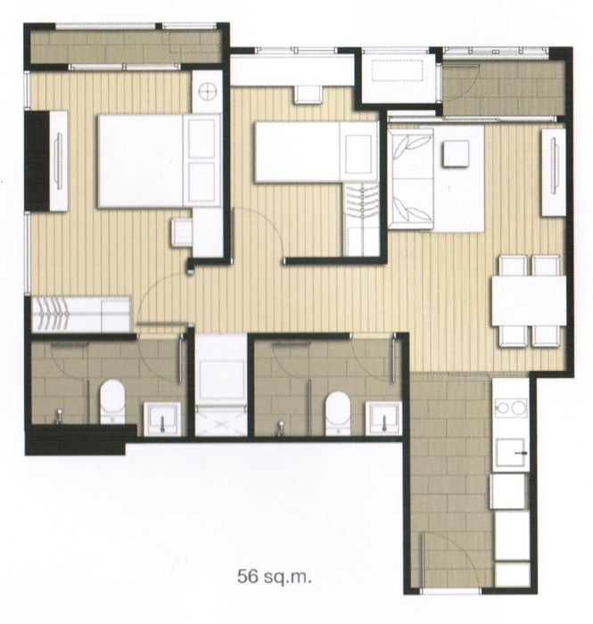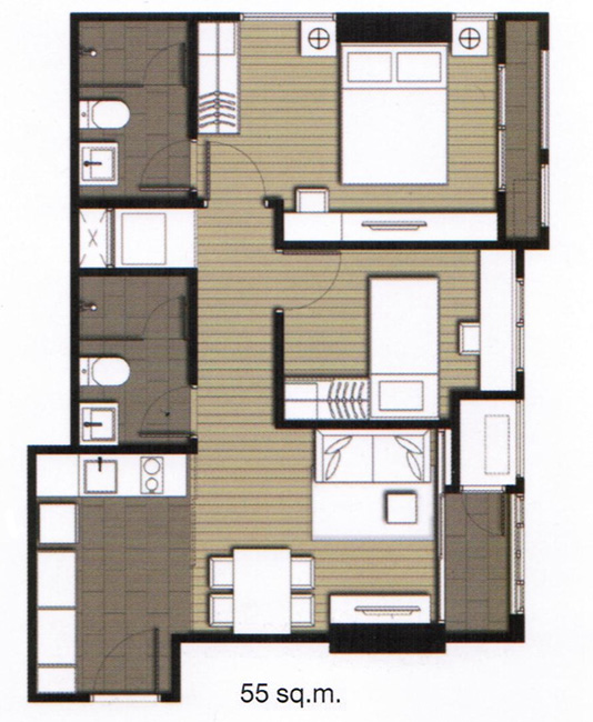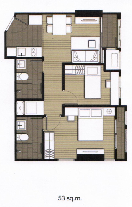 ภาพแปลนห้องแบบ 2 ห้องนอน 2 ห้องน้ำ ขนาด 53 ตร.ม.