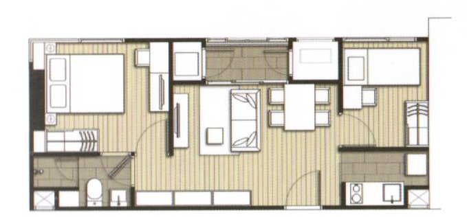 เนื่องจากยูนิตแบบนี้มีเพียง 1 ห้องน้ำ ดังนั้นประตูห้องน้ำจึงมีการออกแบบให้เข้าออกได้สองทาง