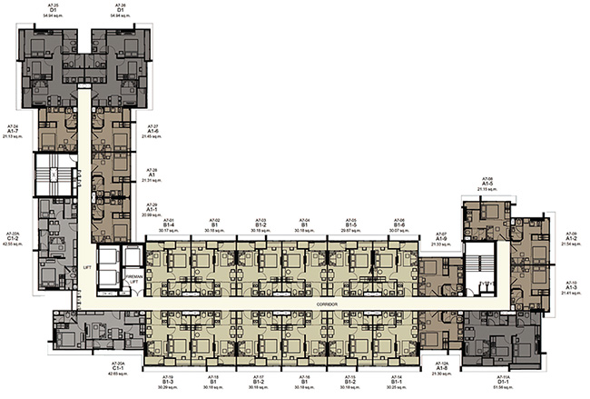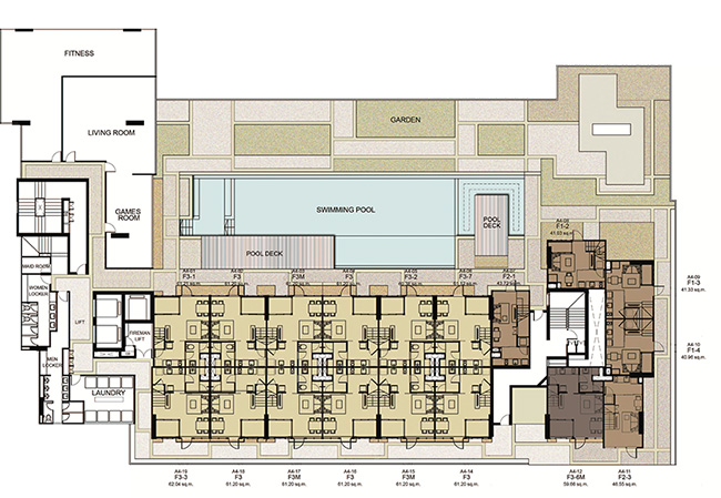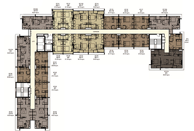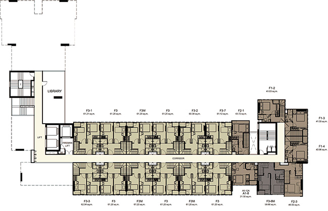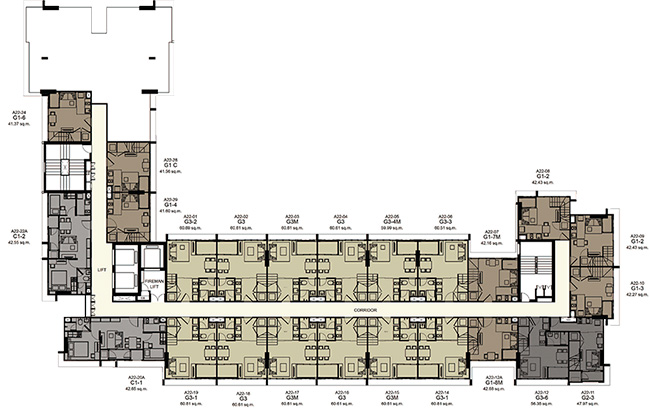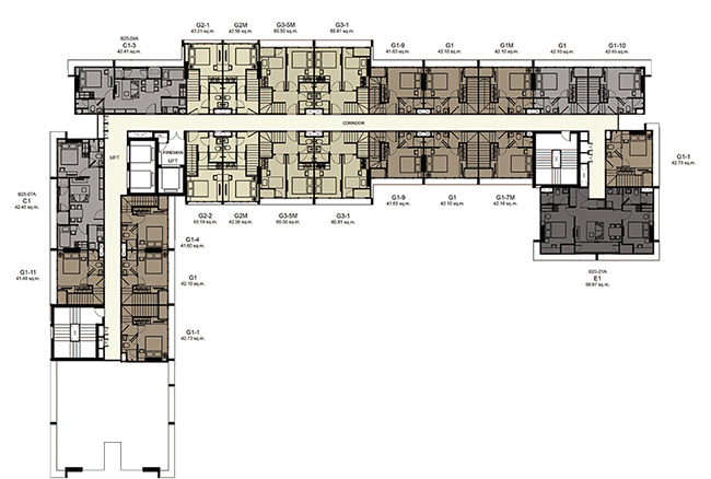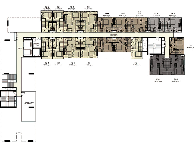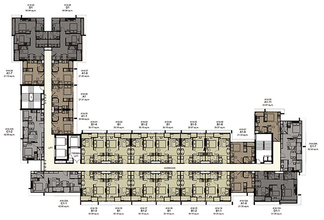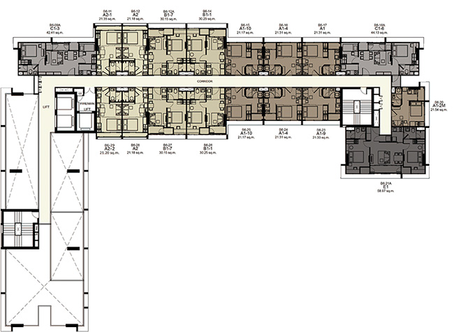 (2 passenger elevators and 1 freight elevator in each building) - ห้องชุดมี 5 ขนาดหลักๆ คือ