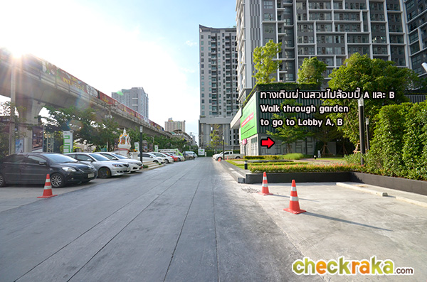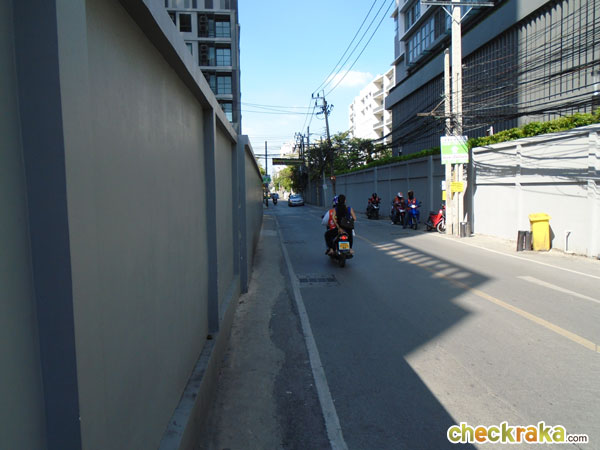 นอกจากนั้นยังมีวินมอเตอร์ไซค์ที่อยู่หน้าปากซอยสุขุมวิท 81 (ห่างจากโครงการประมาณ 20 เมตร) ส่วนป้ายรถประจำทางที่ใหญ่ๆ ก็จะมีอยู่สถานี BTS อ่อนนุช (ด้านหน้า และฝั่งตรงข้ามเทสโก้โลตัส) ซึ่งจะมีรถตู้มาจอดรับคนอยู่หลายสายเหมือนกันค่ะ เดี๋ยวลองมาดูภาพตัวอย่างการเดินจากโครงการไปสถานีรถไฟฟ้า BTS สถานีอ่อนนุช กันนะคะ (In addition, there is a motorcycle taxi pick-up line right in front of the Sukhumvit 81 (about 20 meters away)). There are large bus stops in front of BTS On-Nut Station and Tesco Lotus where shuttle vans, in addition to public buses, normally make a stop to pick up passengers. The photos below show the walking route from the condominium to BTS On-Nut Station)