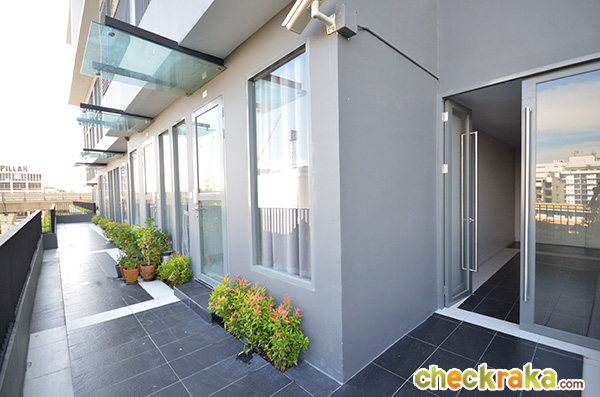 เดินผ่านส่วนรับแขกออกมาที่ระเบียงแบบ Semi Outdoor ซึ่งสามารถเลือกปิด หรือเปิดประตูกระจกบานเลื่อนอะลูมิเนียมชั้นนอกเพื่อรับลมได้ตามแบบฉบับของไอดีโอค่ะ ส่วนงานพื้นบริเวณระเบียงเป็นพื้นกระเบื้องแกรนิตโต้ทำความสะอาดง่ายค่ะ (Then we walk out to the balcony, we can see the semi-outdoor area where the sliding aluminium window